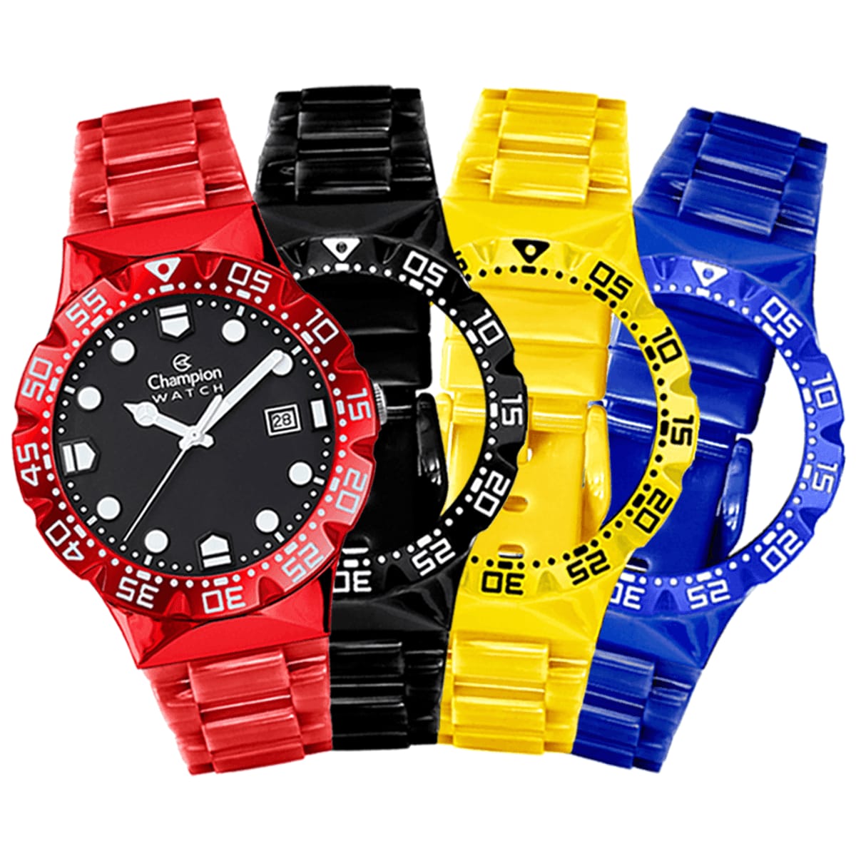 Champion Troca Pulseiras vem com uma caixa metálica de 42mm e 4 pulseiras de plástico em cores incríveis, para você variar e combinar com qualquer look e ocasião. A caixa metalizada e o novo mostrador trazem ainda mais elegância a este modelo icônico. E o conjunto vem recheado de novidades:
