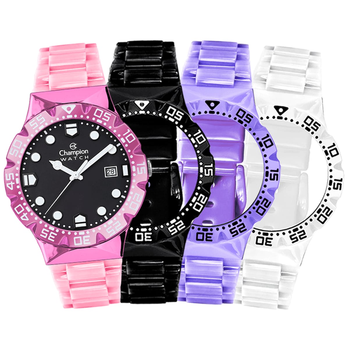 Champion Troca Pulseiras vem com uma caixa metálica de 42mm e 4 pulseiras de plástico em cores incríveis, para você variar e combinar com qualquer look e ocasião. A caixa metalizada e o novo mostrador trazem ainda mais elegância a este modelo icônico. E o conjunto vem recheado de novidades: