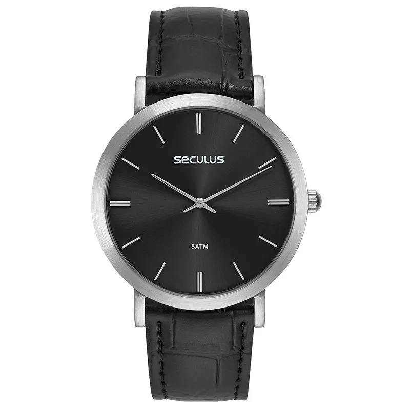 A pulseira em couro com textura croco garante um acabamento refinado, tornando o relógio ideal para ocasiões formais e informais. A resistência da caixa em aço e o design funcional fazem do Seculus uma peça que alia estilo e praticidade. É um acessório atemporal que valoriza o visual masculino.